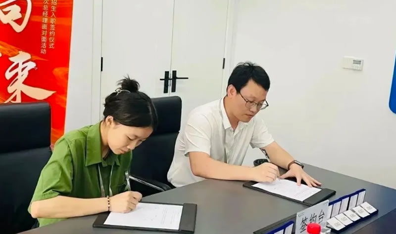 孫通博士代表公司與校招生簽訂勞動(dòng)合同協(xié)議,并逐一握手合影,再一次感謝他們對閣林環(huán)保的選擇。