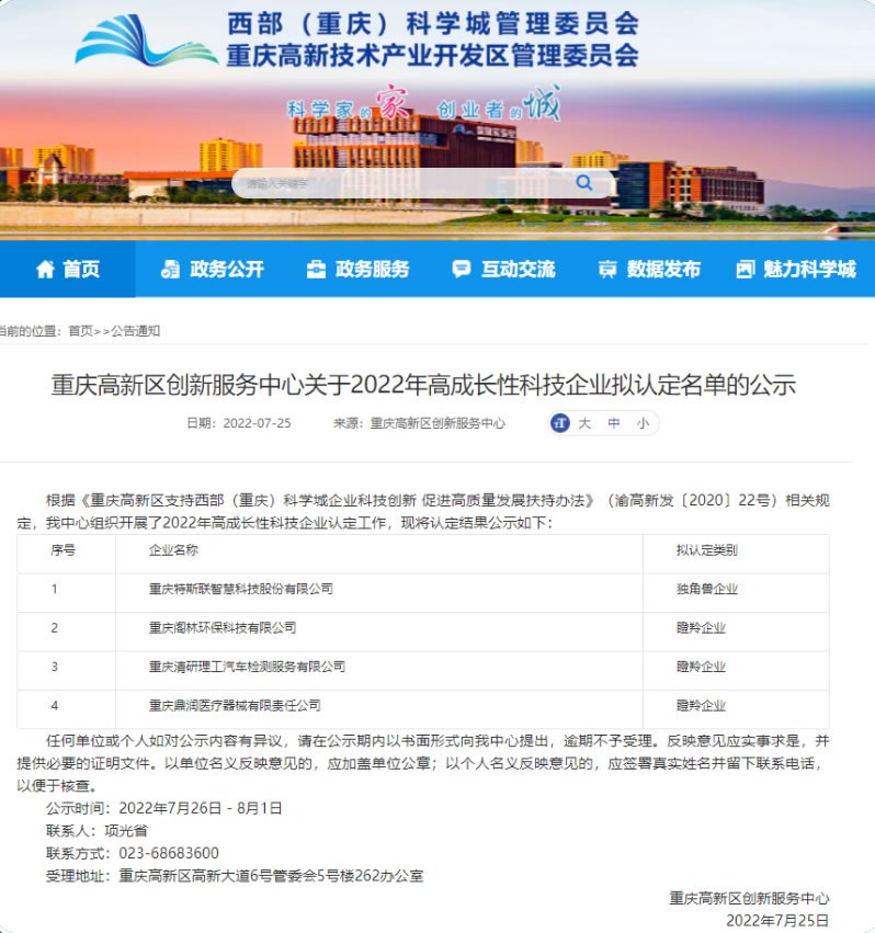 2022年7月25日,重慶高新區(qū)創(chuàng)新服務(wù)中心將重慶高新區(qū)2022年高成長性科技企業(yè)認(rèn)定結(jié)果予以公示,閣林環(huán)保成為重慶高新區(qū)獲評“瞪羚企業(yè)”三家企業(yè)之一。