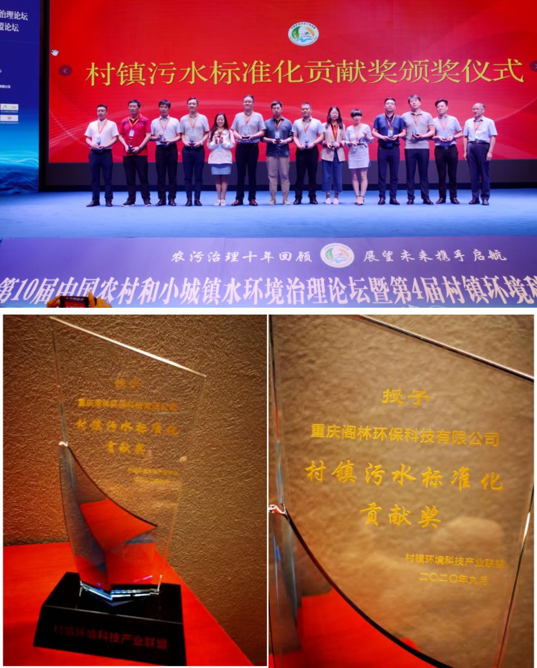 論壇最后舉辦村鎮污水標準化貢獻獎/抗擊新冠疫情貢獻獎頒獎儀式。對參與制定《小型生活污水處理設備標準》《小型生活污水處理設備評估規范》《村莊生活污水處理設施運行維護技術規程》三項團體標準以及在新冠疫情期間做出突出貢獻的行業企業進行表彰與鼓勵。重慶閣林環保科技有限公司得到專家與行業同仁的認可,獲村鎮污水標準化貢獻獎。