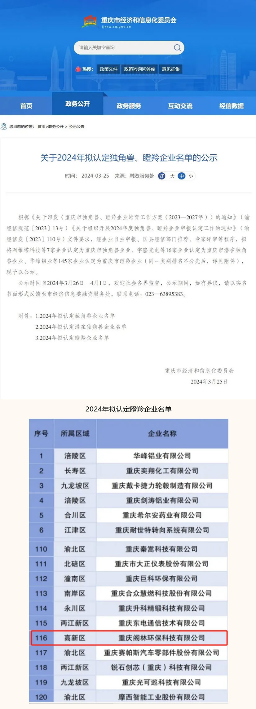 近日,重慶市經濟信息委發布2024年度市級獨角獸及瞪羚企業評選認定公示名單,重慶閣林環保科技有限公司(以下簡稱“閣林環保”)榮獲2024年度重慶市“瞪羚企業”稱號。